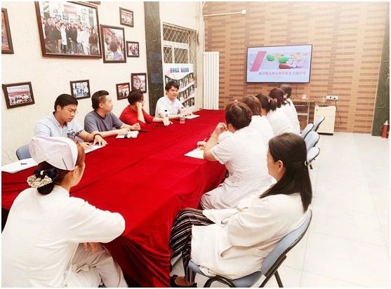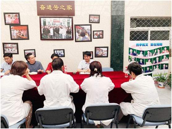 在第七门诊部内“奋进号之家”,徐杰主任与参加主题沙龙活动的医务人员关于美沙酮及相关药物使用问题在药理学、临床医学等方面展开了热烈而深入的讨论。